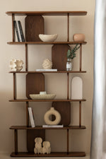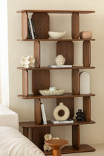 Step into a space where your taste takes the lead. Rich, deep walnut tones meet softly curved edges and smooth, vertical lines, giving you a canvas to showcase your favorite books, sculptural vases, and personal treasures. The warm grain invites touch, while the open shelves allow light to dance through each tier, creating a harmonious balance of display and serenity. Its artisanal feel and mid-century silhouette elevate your sanctuary into an elegant gallery of your own stories.
